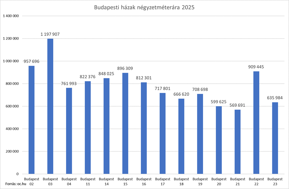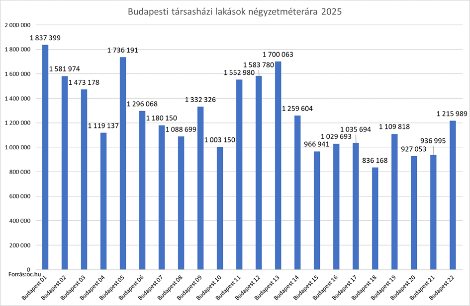 A tavalyi évben a fővárosban 1,379 millió forint volt a használt téglalakások négyzetméterára. Minden negyedévben emelkedtek az árak, ennek köszönhetően a 2024-es év átlagához képest összeségében 22,6%-kal drágultak a lakások. Az eladások alapján a legdrágábbnak az V. kerület bizonyult 1,74 millió forinttal négyzetméterenként, míg a XVIII. kerület 836 ezer forinttal lett a legolcsóbb.