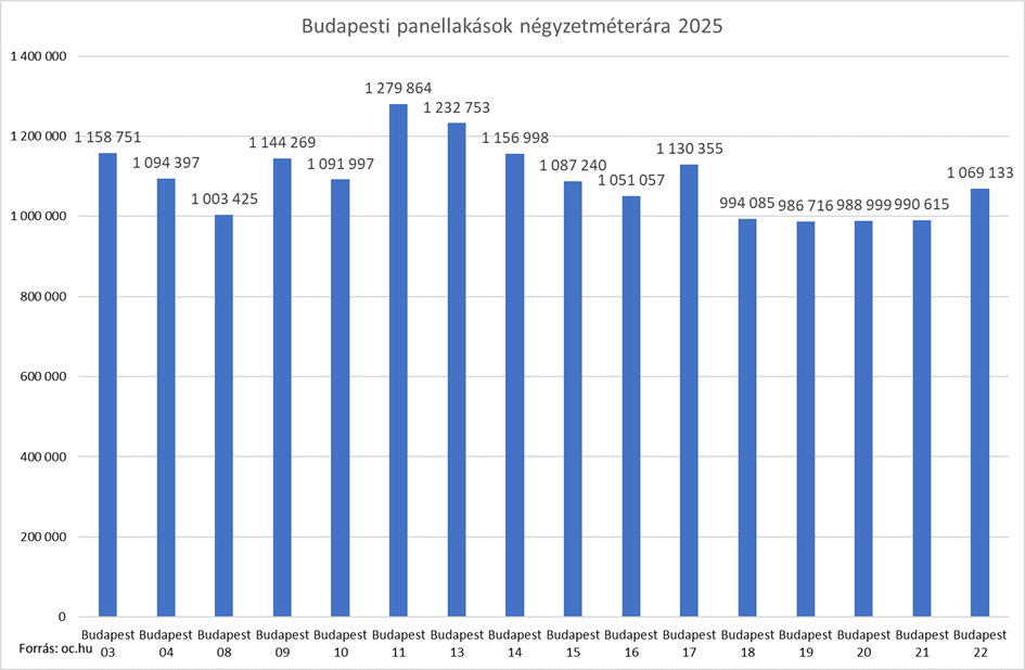 A panellakások négyzetméterára 1,123 millió forint volt a tavalyi évben. Ez esetben is minden negyedévben emelkedtek az árak, így a 2024-es év átlagához képest, 36,4%-kal drágultak a panellakások egy év alatt. Ebben a szegmensben a legdrágább a XI. kerület lett, átlag 1,28 millió forintos négyzetméterárral, míg a legkedvezőbb ár a XX. kerületben volt jellemző, átlag 989 ezer forinttal.